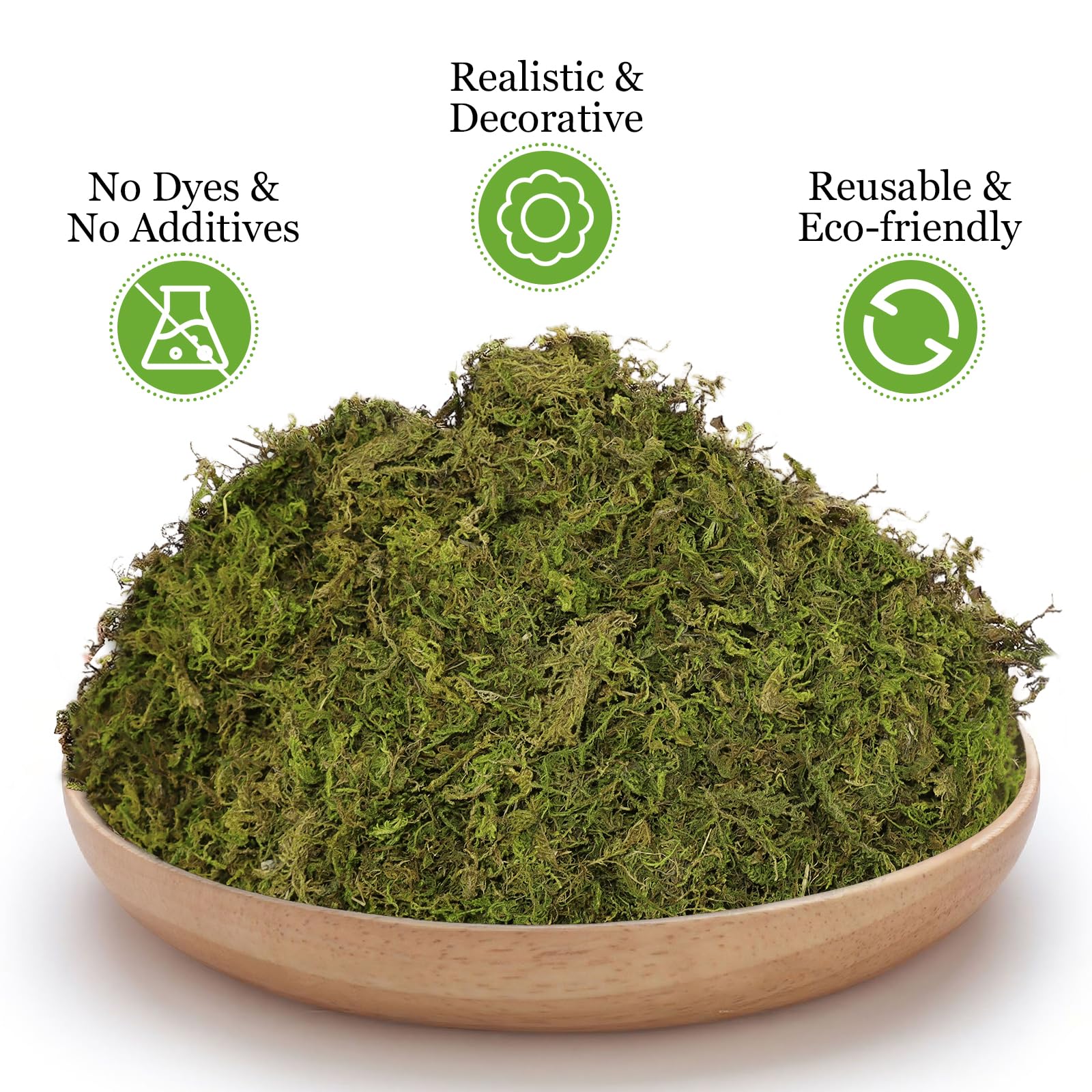 - Premium Material: Stunning texture and color. This nice natural-looking preserved faux moss contains no odd smells and no dyes. Soft to touch and looks very pretty. Our long-lasting fake moss can be stored and used for a long time with no water, soil, fertilizer neede