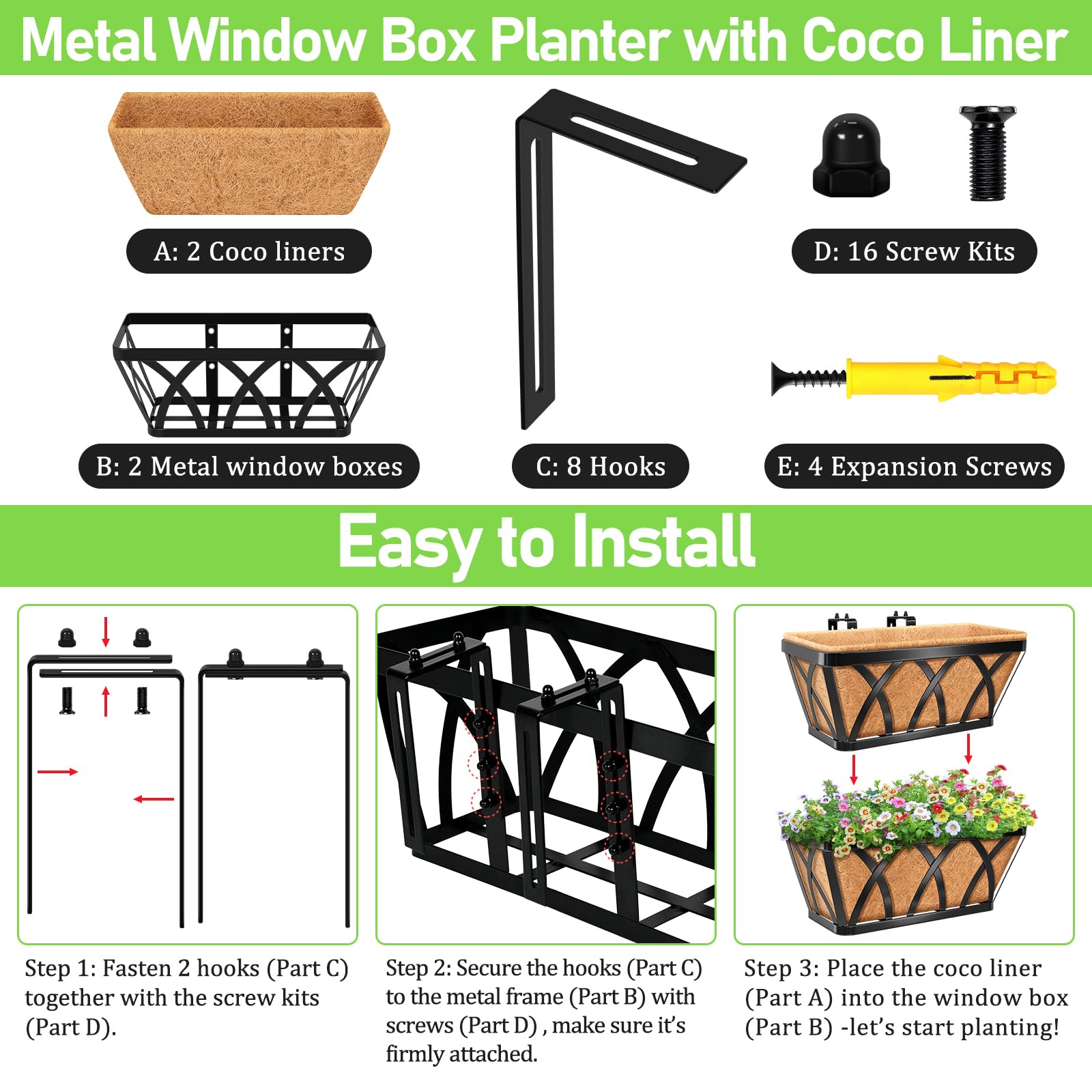 - Easy to Assemble: Complete accessory set includes L-shaped hooks, screw kits, and expansion screws for easy assembly. Simply follow instructions to adjust the hooks (fits 2.95-6.5 inch railings) for secure mounting on most standard rails, hang the window boxes planter, add the coir liner, and start growing your favorite flowers. Expertly designed for maximum stability, built for long-lasting use with peace of mind