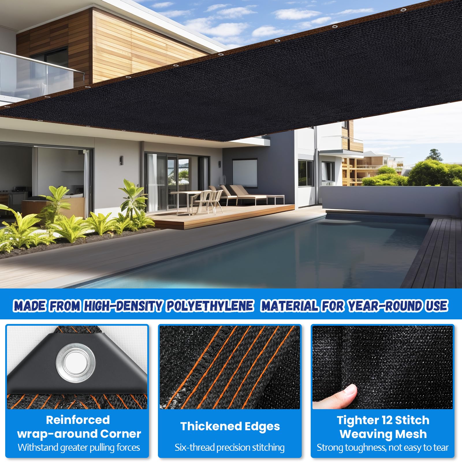 - Sturdy and Tough: Our shade net cover feature the tighter 12 stitch weaving mesh protects your privacy while air can still circulate, creating a comfortably cool place to shade people or plants. Equipped with solid copper metal grommets on the edge, sturdy six locking edges and four reinforced corners allow the mesh to withstand greater tensile strength and are less likely to break